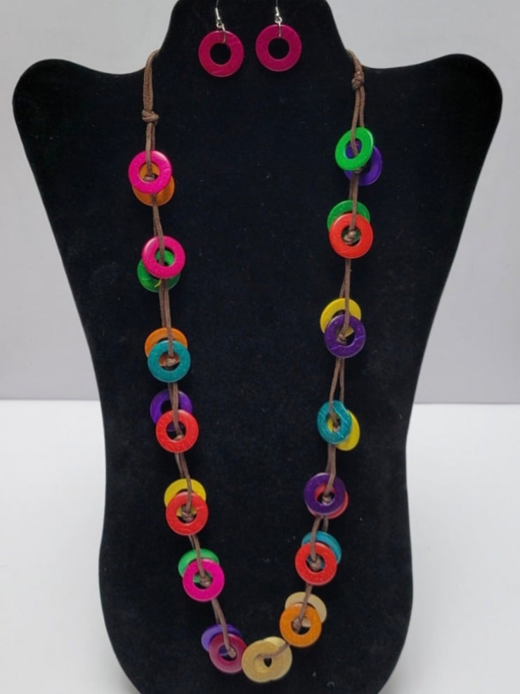 Make a bold and playful statement with this vibrant necklace and earring set. Featuring a series of lightweight, multicolored circular accents strung along a natural cord, this piece adds a fun burst of color to any outfit. The coordinating drop earrings mirror the circular design for a perfectly matched look. Ideal for casual wear, vacations, or adding personality to simple styles, this set is both eye-catching and comfortable.