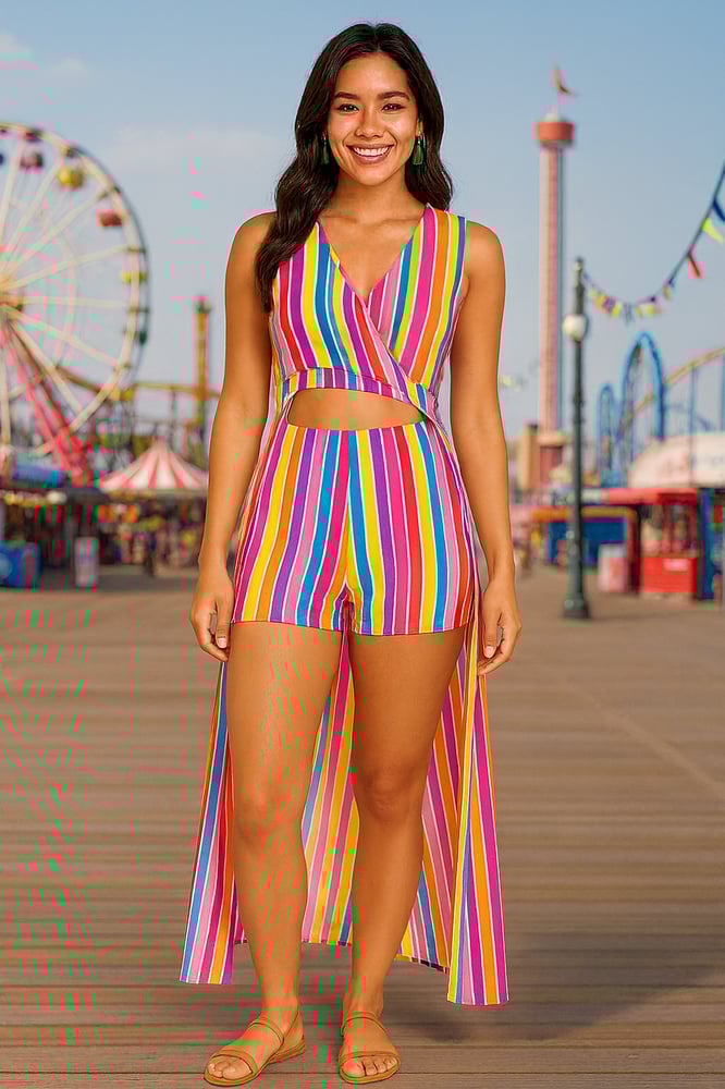 Turn heads in this bold and colorful 2-piece short set featuring vertical rainbow stripes that radiate summertime fun. The sleeveless crop top is designed with a stylish front crossover cutout, offering a flirty glimpse of skin while maintaining a chic silhouette. The matching high-waisted shorts provide a flattering fit and effortless comfort.
