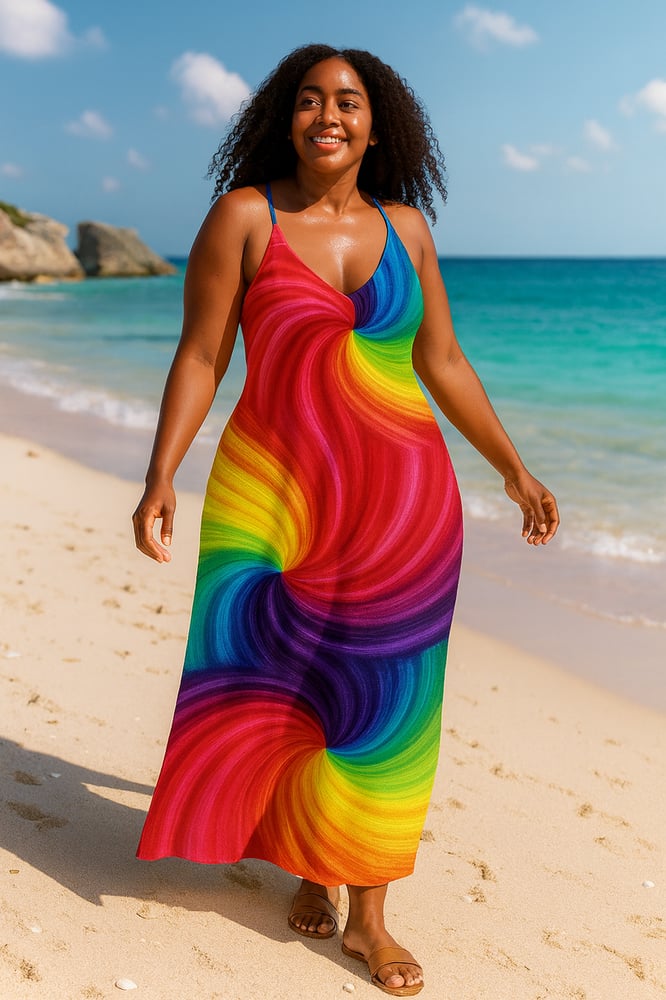 Turn heads in this vibrant Long Boho Dress, designed to bring bold color and effortless comfort to your wardrobe. Featuring a dynamic rainbow swirl pattern that radiates energy and joy, this eye-catching maxi dress is perfect for sunny days, festivals, beach strolls, or casual outings.